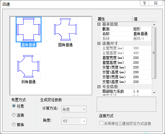 风管四通界面如所示,可在左侧图示列表中选择四通类型,右侧列表中为所选三通参数。