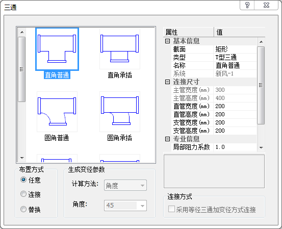 风管三通界面如所示,可在左侧图示列表中选择三通类型,右侧列表中为所选三通参数。