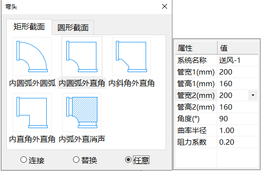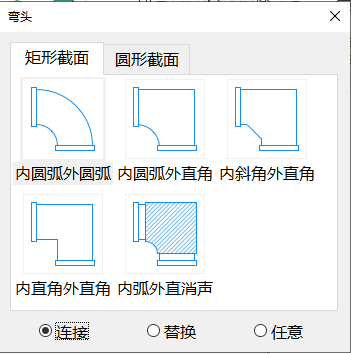 风管弯头界面如所示,可在页签中选择弯头类型,在下方单选按钮选择需要放置弯头方式。