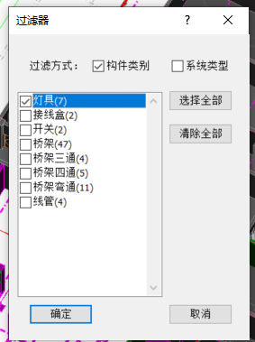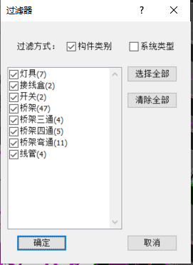 目录 搜索 展开 首页乘车路线版权与商标说明免责声明通用功能链接软件答疑与交流更新说明20262026 R1.22026 R1.12026 R1.020252025 R2.12025 R2.02025 R1.22025 R1.120242024 R2.22024 R2.12024 R2.02024 R1.42024 R1.32024 R1.22024 R1.12024 R1.020232023 R2.42023 R2.32023 R2.22023 R2.02023 R1.12023 R1.52023 R1.42023 R1.32023 R1.22023 R1.020222022 R3.12022 R3.02022 R2.32022 R2.22022 R2.12022 R2.02022 R1.42022 R1.32022 R1.22022 R1.0应用环境运行环境启动界面操作界面快速访问工具栏视图盒子模型操作视图区命令提示行项目浏览器属性面板多窗口显示设置视图工具条光照亮度三维坐标捕捉设置暖通专业设计暖通专业工程设置风系统设置水系统设置风管默认连接设置风管建模设置水管建模设置水管件默认设置风管材料设置水管材料设置地暖盘管材料设置二维设置空调风系统风管绘制风管编辑风立管风管连接件风管对齐风口布置风口连接静压箱换气扇、风机挡烟垂壁空调水系统水管绘制布空调立管多管绘制水管连接水管编辑风盘连水多联机系统室内机室外机多联机连管多联机分歧管采暖系统布散热器立干连接散立连接散干连接散散连接自动盘管手绘盘管盘管打断盘管合并布分集水器连分集水器设备及附件布置风盘水泵常用基础通用组合空调风阀消声器风管软连接水阀仪表角阀三通阀水管软接头组合阀暖通识图建模DWG编辑风管识图翻模水管识图建模风口识图翻模识别水阀仪表暖通标注风管标注风口标注管线文字水管标注立管标注出入户管标注管道坡度标注引出标注给排水专业设计给排水专业工程设置给排水系统设置管件默认设置给排水建模设置水管材料设置二维设置管道建模水管绘制多管绘制布水立管水管连接水管编辑水管连接件管道附件布置自动连接标准连接设备布置与连接卫浴布置卫浴连接水箱水泵基础集水坑排水沟室外设备通用消防系统建模消火栓系统布置与连接自动喷淋系统布置与连接气体灭火建模计算灭火器建模给排水识图建模消火栓识图建模消防喷淋系统水管识图建模水阀识图建模给排水标注管线文字水管标注立管标注出入户管标注喷头定位标注管道坡度标注引出标注电气专业设计电气专业工程设置线管系统设置桥架系统设置桥架默认连接件设置线管建模设置线管材料设置二维设置线管/桥架绘制桥架/线槽桥架布置桥架分支选择竖直桥架布置多层桥架桥架连接线管/导线线管布置竖直线管线管连接线管空间连接导线布置线管对齐强电系统设备灯具开关插座接线盒通用设备布置楼梯间布置防雷接地导体布置防雷布置接地布置弱电系统设备温烟感布置消防报警弱电通用综合布线变配电设备配电箱布置引出线管引出桥架配电箱系统检索变压器配电柜设备基础母线槽布置母线槽连接电缆沟设备连接设备连接连配电箱接口连接连接桥架电气专业计算区域照度计算防雷计算房间照度计算电气负荷计算电流计算负荷计算查看报告书电气专业标注引线布置灯具标注桥架标注导线标注标配电箱标水暖设备标导线数&根数修改设备标注回路标注&回路识别电气识图建模DWG处理工具电气设备点位桥架翻模设备库编辑设备库管理新建设备专业信息添加拆开设备整体缩放导入revit族组合设备库导入模型编辑过滤选择增强过滤器检查分支编辑水平设备标高分支标高分支选择坡度调整设备替换设备编号楼层归属删除重复拾取/刷新属性测量长度面积标高坐标支吊架布置支吊架布置支吊架延管拷贝支吊架沿线拷贝支吊架编号管线综合碰撞检查碰撞检查碰撞结果碰撞报告书管道编辑水暖空间搭接水暖局部调整线管局部调整桥架升降调整间距调整水管标准连接管道合并/打断水管对齐通用对齐管综平面图三维标注局部剖切专业协同合并工程净高分析净高设置净高平面净高检查水暖提资开洞提资任意布洞自动开洞开洞设置取消洞口开洞列表布置套管云协同材料统计材料统计统计结果清单生成清单样式清单结果支吊架统计模型审查审查流程全局属性智能审查通用工具设可见性查找构件选择过滤增强过滤测量工具基本建模模板标高机制机电专业标高机制构件复制 暂无相关搜索结果! 过滤选择 点击【编辑】-【过滤选择】-【选择过滤】,弹出界面如下图: 操作步骤 选中模型中构件,然后点击[选择过滤],弹出过滤器界面,如图所示,左侧类别框中会出现模型中所有选中构件的类型,勾选要过滤出的构件类别,例如灯具,点击确定,此时模型中被勾选的构件类别被过滤出,然后可以对该类别构件进行统一编辑。 功能说明 【选择全部】 点击选择全部,左侧类别栏中所有构件类别处于勾选状态; 【清除全部】 点击清除全部,取消所有左侧类别栏中构件类别勾选状态。
