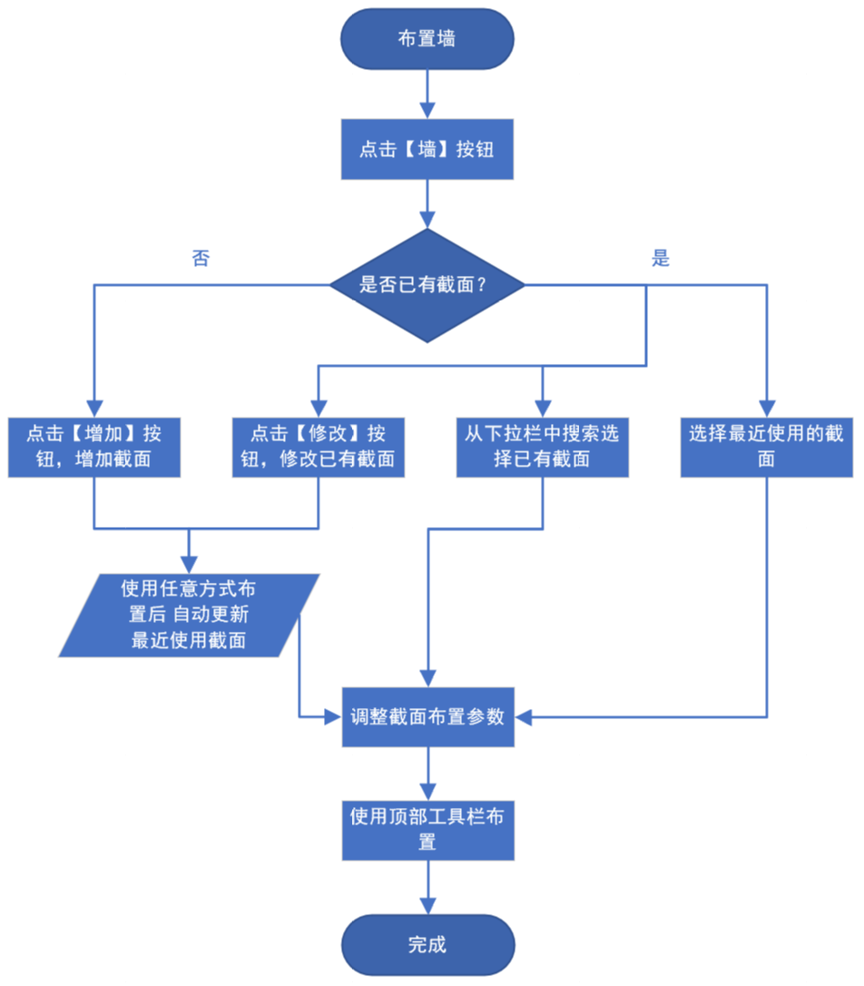 在墙布置栏顶部,是墙截面下拉栏。该下拉栏中显示当前正在被布置的墙截面信息,包括材料类别、截面类型、截面尺寸和截面名称(若有)。点击该区域可激活截面下拉栏,其中显示该项目所有楼层中的墙截面。用户可在该下拉栏中选择希望被布置的墙截面。