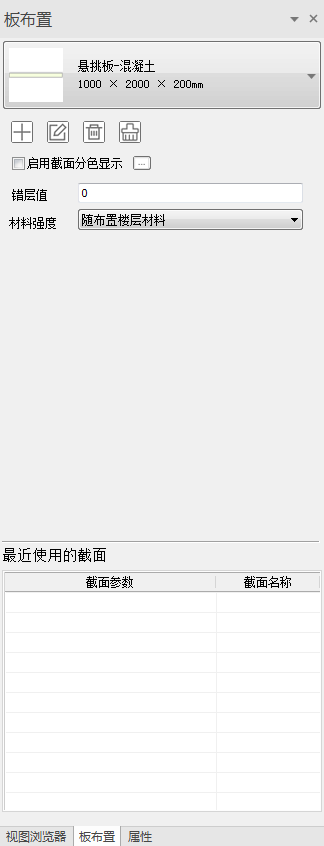 悬挑板的下拉栏及下方的增加、修改、删除、清理按钮、截面分色显示、最近使用的截面操作同柱布置。