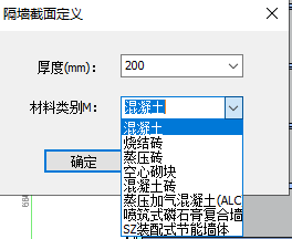 “隔墙布置”对话框中列出了已定义的隔墙截面,点击增加即可进行隔墙。弹出如图4.4定义界面,可以输入厚度及材质。
