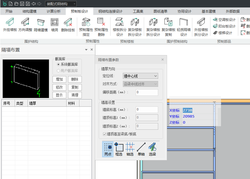 用户可通过“预制板设计—围护结构—隔墙建模”实现隔墙的交互布置。目前程序内提供五种布置方式供用户选择,包括两点布墙、框选布墙、轴选布墙、单轴布墙和选梁布墙(图4.3)。