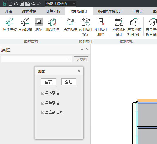单击“删除挂板”,弹出删除对话框,用户可以勾选需要删除的预制构件,同时鼠标变为捕捉状态,通过点选构件以进行删除操作。如图 4.5所示。