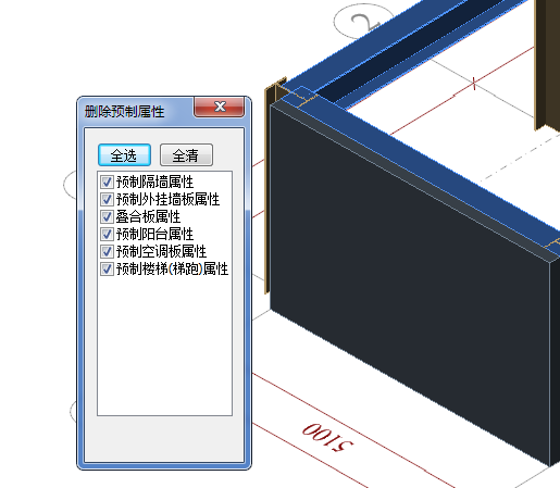单击“预制属性删除”,弹出删除对话框,鼠标变为捕捉状态,用户可以勾选对话框中需要删除的预制属性,再点选需要进行操作的构件,以完成删除操作。如图 4.7所示。