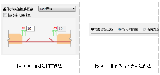 此选项的作用:影响计算。长宽比不大于3的楼板,当采用分离式接缝时,该楼板下铁钢筋按照单向板计算,上铁钢筋取单向计算和双向计算的包络值;影响钢筋端部做法。双向叠合板在叠合板间接缝处和非支承方向支座处均采用钢筋伸出的做法。单向叠合板在叠合板间接缝处不出筋,非支承方向支座处可选出筋。因此,叠合板板缝处钢筋做法进对双向叠合板生效,如图4.10和图4.11所示。
