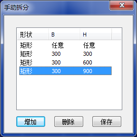 单击“手动拆分”,弹出如图 4.39所示对话框。用户可对板库进行编辑,点“增加”按钮增加一种板,点“删除”按钮删除,点“保存”按钮保存对板库的修改,双击相应的单元格可修改板尺寸。选择尺寸为“任意”的板可在屏幕上拖动布板,选其它板可在屏幕上布置相应尺寸的板。已布置好的板可以点右键进行删除、移动和复制的操作,并可拖动夹点修改板的尺寸和位置。