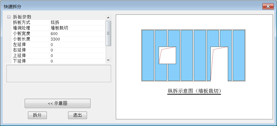 单击“快速拆分”,弹出如图 4.37所示对话框。提供“纵拆”、“横拆”和“大板拆”三种拆分方式。同时可以设置板长,宽以及上下左右延伸长度以用于调整拆分方案。点击“拆分”进行自动拆分。
