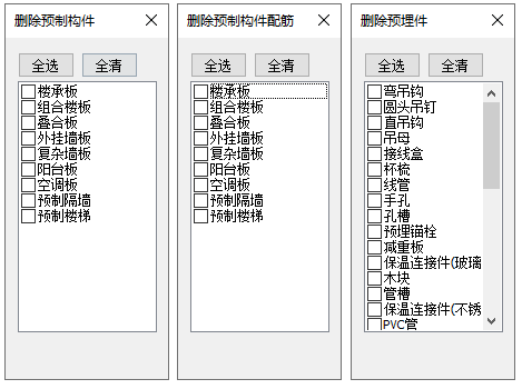 预制构件删除提供删除构件、删除配筋、删除预埋件、单参修改功能。点击不同命令按钮会弹出相应对话框,用户可以勾选其中提供的构件类型。同时鼠标变为捕捉状态,通过点选构件完成删除操作。如图 4.45所示。