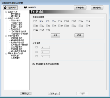 点击“连接参数”,进入三维节点设计参数定义对话框,需要填写的节点设计控制参数项目包括:连接设计参数、连接构造参数、吊车轨道节点参数、连接类型定义等,程序根据用户定义的相关参数,生成相关连接,如图5.2所示。