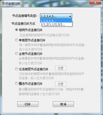 (3)全楼节点连接归并:全楼模型中构件截面相同的同类型钢结构节点连接,由小往大进行归并。