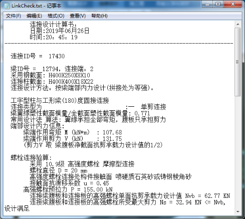 点击连接计算书鼠标变为选择状态,在界面中左键选中需要查看的连接节点球,即时弹出该连接的计算书结果,如图5.35所示。