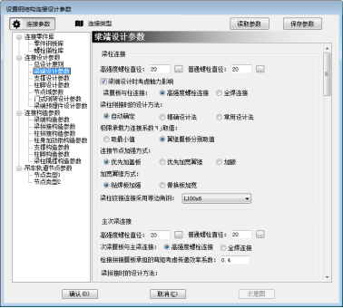梁柱铰接以及主次梁铰接连接采用的等边角钢,该项适用于在选择的梁柱铰接连接中有采用角钢连接的类型的梁柱连接,程序优先采用选定的等边角钢类型,两种类型可以分开设置。