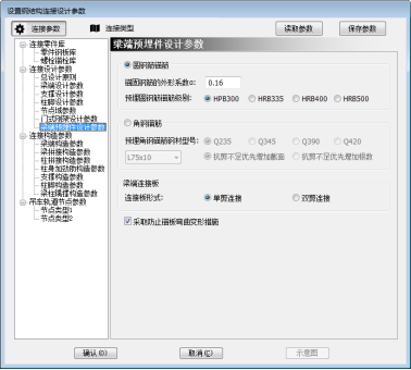 对于钢和混凝土组合结构,部分钢梁要混凝土构件通过预埋件相连,通过预埋件参数,程序可以自动完成圆钢筋锚筋的预埋件和角钢锚筋预埋件的设计。参数界面如图5.11所示。
