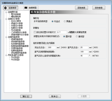 柱身加劲肋构造参数输入的是梁柱连接时加劲肋的设置方式,以及矩形钢管混凝土柱的内隔板形状,如图5.16所示。