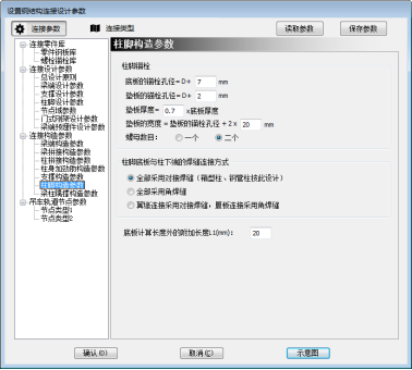 柱脚控制参数是在进行柱脚自动设计时的柱脚连接节点的各种参数,如图5.20所示。