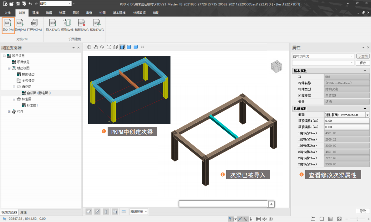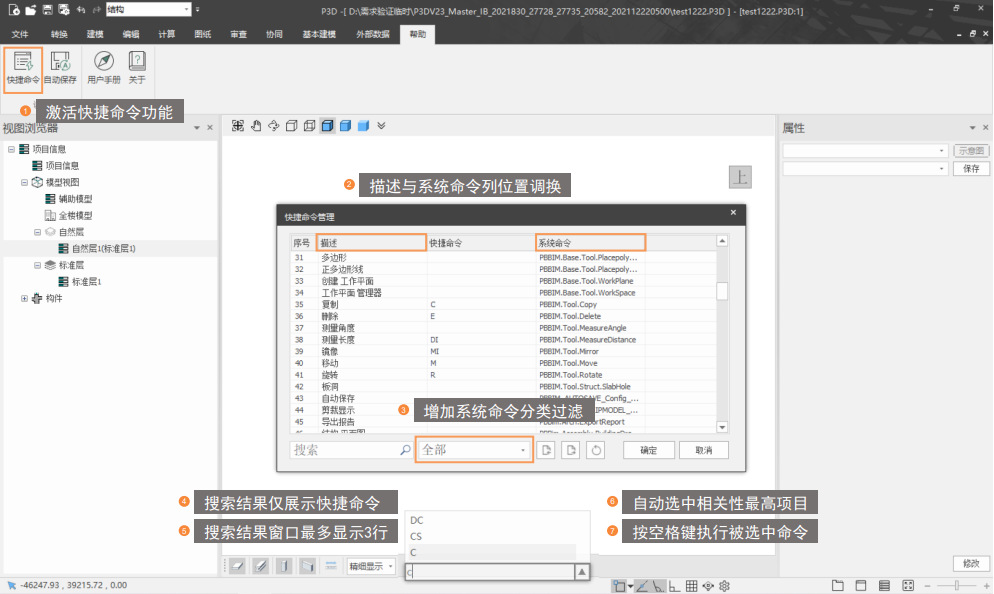目录 搜索 展开 首页乘车路线版权与商标说明免责声明更新说明20242024R1.020232023R1.020222022R3.12022R3.02022R2.32022R2.22022R2.12022R2.02022R1.42022R1.32022R1.22022R1.0工作环境最低运行环境启动界面用户操作界面快速访问工具栏视图盒子模型操作视图区命令提示行项目浏览器属性面板多窗口显示设置视图工具条光照亮度三维坐标捕捉设置通用操作功能键右键菜单临时辅助线抬头工具栏追踪器弹出式编辑小面板注释注释工具逐点标注直径/半径标注弧长标注角度标注标高标注引出标注自动标注箭头标注二维工具线型二维工具通用文字单行文字多行文字通用表格协同设计构件级协同云链接参照模型底图参照合并工程链接模型链接P3D/PMODEL链接管理净高分析净高设置净高平面净高检查净高刷新碰撞检查碰撞检查碰撞列表碰撞结果基本建模图形平面实体工具布尔运算工作平面外部数据Python构件库组件库导入导出其他功能3D剖切工具快捷命令自动保存类型属性管理器增强过滤器正向设计专业功能建模识图建模导入DWG识别构件偏心调整梁平法识别结果查看卸载、移动DWG轴网定位上部结构布置柱布置梁布置斜杆布置墙布置板布置楼梯布置悬挑板布置墙洞布置板洞布置全房间洞布置梁加腋截面分色最近使用截面拾取和截面刷基础构件独立基础筏板地基梁柱墩桩基桩基承台楼层管理楼层组装全楼信息增/删标准层全楼移动工具测量长度测量角度编辑修改参数修改构件参数构件替换构件删除通用对齐梁板对齐基线对齐通用编辑工具相互打断相互裁切墙合并梁合并墙梁合并构件延伸组合层间编辑楼层复制局部复制模型调整模型检查精度检查精度调整计算与PKPM双向更新显示更新信息图纸图纸生成导出PDF/导出DWG图纸管理图块移动图纸批量管理图纸删除EasyBIM-S施工图出图流程视图视图属性视图裁剪框复制视图/标注跨视图复制生成图纸视口机制审查图纸识别智能审查结果查看和导出报告协同结构构件开洞管理显示显示构件构件颜色裁剪显示构件子类别管理显示管理全局显示样式构件可见性方案视图覆盖方案注释楼层表梁标注板标注 暂无相关搜索结果! 2022R1.4 集成通用1.快捷命令功能优化2.设置背景色的生效规则 结构专业1.项目浏览器中新增组合2.新增:柱、梁、墙轴选布置方式3.新增:增强过滤器功能4.新增:导入PM次梁功能5.构件配色方案更新6.其他更新内容(1)为对接中信智能构件库,增加三个Ribbon图标;(2)导出FBX时可按构件类型区分结构构件;(3)为对接品茗算量模块,增加直接导出XDB文件功能。