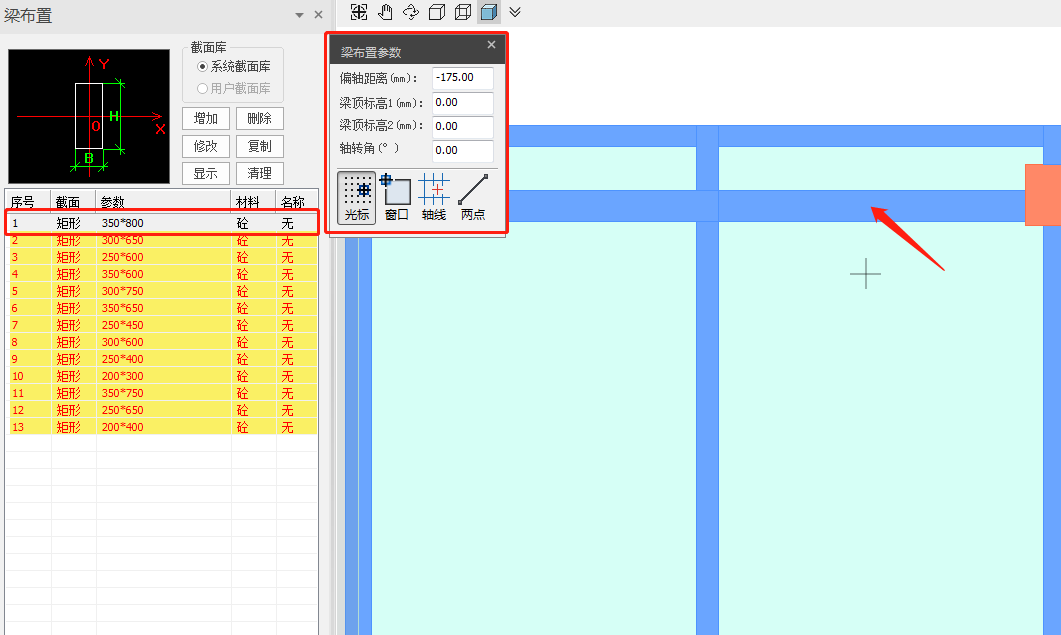 拾取主要是用选中构件的截面、偏心、标高、转角等参数来布置同类构件。如图所示。点击拾取图标后,程序提示选择构件。当用户选中某根梁构件后,程序会自动弹出梁布置对话框,并显示该根梁的截面和布置参数,用户可直接按照此参数进行梁布置,也可以修改相应参数后再进行梁布置。请注意:拾取布置支持的构件包括梁、柱、墙、板、悬挑板、斜杆、墙洞、板洞。