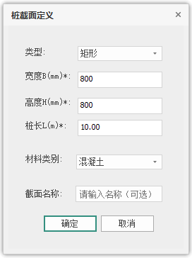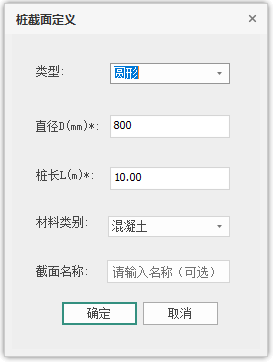 后,将弹出新建桩基截面对话框,如图所示。可在该对话框中选择截面类型、输入截面数值参数。截面名称为方便用户管理截面设置,可不输入。点击确认后即可新建截面。