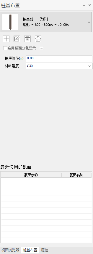 - 在桩基截面栏下方是对截面的管理功能,从左至右分别是新建、修改、删除和清理。点击新建按钮