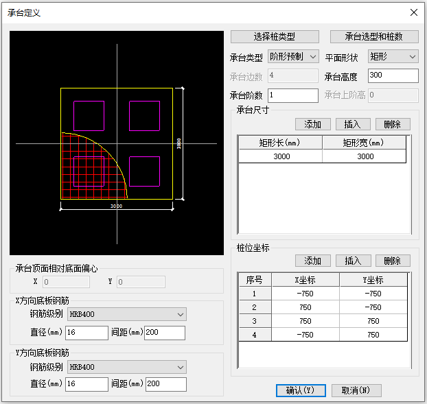 后,将弹出新建桩基承台截面对话框,如图所示。可在该对话框中选择桩类型、承台类型、输入截面数值参数、桩位坐标等。截面名称为方便用户管理截面设置,可不输入。点击确认后即可新建截面。