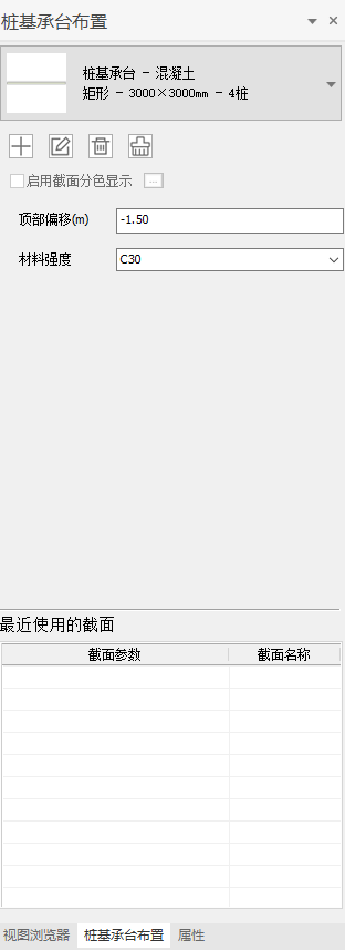 - 在桩基承台截面栏下方是对桩基承台的管理功能,从左至右分别是新建、修改、删除和清理。点击新建按钮