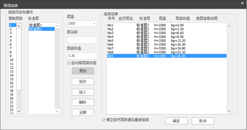 - 楼层组装过程中,会自动获取当前工程中已经定义好的标准层,用户根据设计需要,通过增加,修改,删除,全删等按钮的操作,在右侧的列表框中形成楼层组装列表信息。