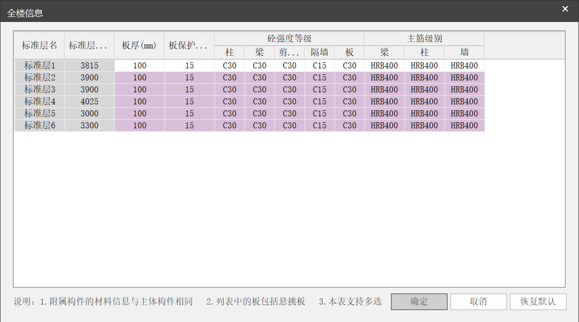- 在全楼信息对话框中,会列出所有已建标准层,在标准层信息表中包含了标准层名,标准层高,板厚,板保护层厚度,砼强度等级,主筋级别。其中标准层名这一栏是根据标准层号从小到大排列。标准层高这一栏中的数值为新建该标准层时输入的层高,现已支持修改。其余表中各项信息均支持修改,且支持多选修改。