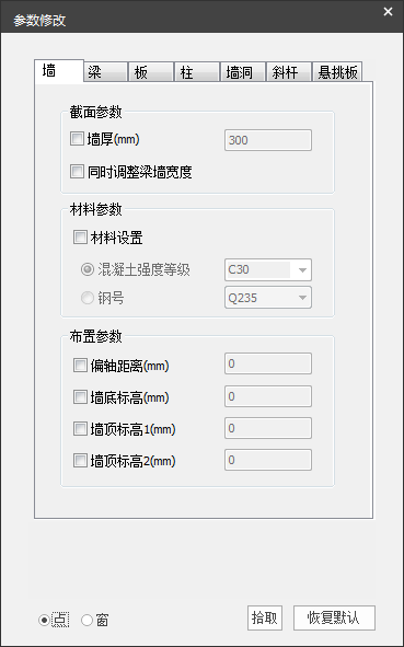 以墙构件为例,修改参数包括:截面参数(墙厚、同时调整梁墙宽度),材料参数(混凝土强度等级、钢号),布置参数(偏轴距离、墙底标高、墙顶标高1、墙顶标高2),需要用户选择勾选参数修改项。