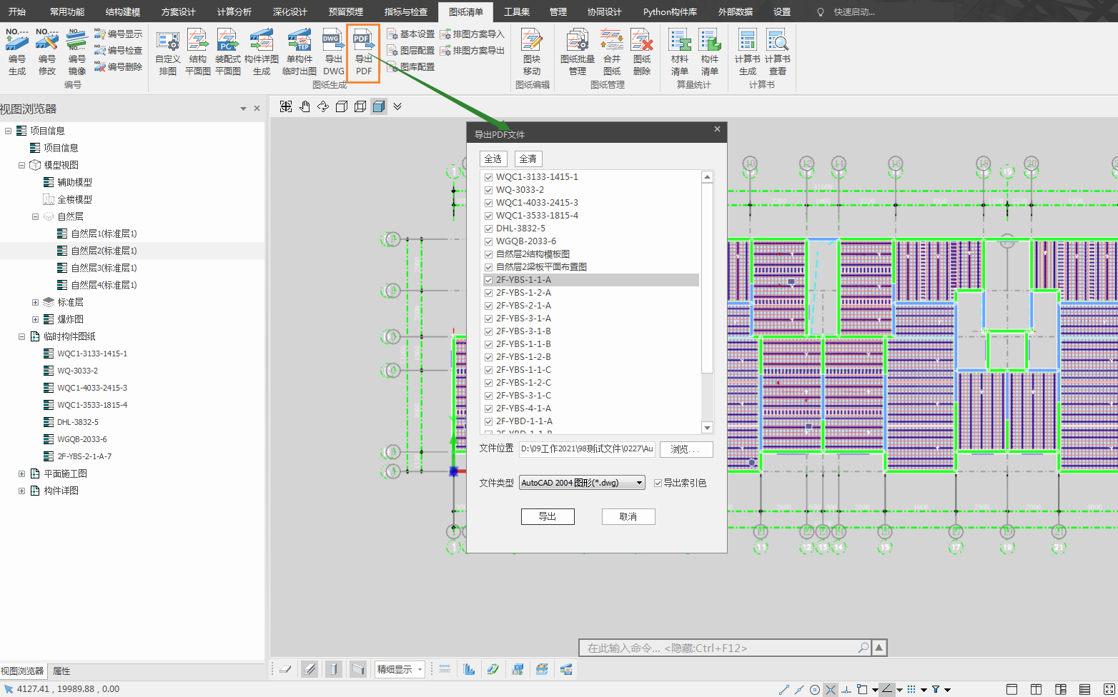 目录 搜索 展开 首页乘车路线版权与商标说明免责声明更新说明20242024R1.020232023R1.020222022R3.12022R3.02022R2.32022R2.22022R2.12022R2.02022R1.42022R1.32022R1.22022R1.0工作环境最低运行环境启动界面用户操作界面快速访问工具栏视图盒子模型操作视图区命令提示行项目浏览器属性面板多窗口显示设置视图工具条光照亮度三维坐标捕捉设置通用操作功能键右键菜单临时辅助线抬头工具栏追踪器弹出式编辑小面板注释注释工具逐点标注直径/半径标注弧长标注角度标注标高标注引出标注自动标注箭头标注二维工具线型二维工具通用文字单行文字多行文字通用表格协同设计构件级协同云链接参照模型底图参照合并工程链接模型链接P3D/PMODEL链接管理净高分析净高设置净高平面净高检查净高刷新碰撞检查碰撞检查碰撞列表碰撞结果基本建模图形平面实体工具布尔运算工作平面外部数据Python构件库组件库导入导出其他功能3D剖切工具快捷命令自动保存类型属性管理器增强过滤器正向设计专业功能建模识图建模导入DWG识别构件偏心调整梁平法识别结果查看卸载、移动DWG轴网定位上部结构布置柱布置梁布置斜杆布置墙布置板布置楼梯布置悬挑板布置墙洞布置板洞布置全房间洞布置梁加腋截面分色最近使用截面拾取和截面刷基础构件独立基础筏板地基梁柱墩桩基桩基承台楼层管理楼层组装全楼信息增/删标准层全楼移动工具测量长度测量角度编辑修改参数修改构件参数构件替换构件删除通用对齐梁板对齐基线对齐通用编辑工具相互打断相互裁切墙合并梁合并墙梁合并构件延伸组合层间编辑楼层复制局部复制模型调整模型检查精度检查精度调整计算与PKPM双向更新显示更新信息图纸图纸生成导出PDF/导出DWG图纸管理图块移动图纸批量管理图纸删除EasyBIM-S施工图出图流程视图视图属性视图裁剪框复制视图/标注跨视图复制生成图纸视口机制审查图纸识别智能审查结果查看和导出报告协同结构构件开洞管理显示显示构件构件颜色裁剪显示构件子类别管理显示管理全局显示样式构件可见性方案视图覆盖方案注释楼层表梁标注板标注 暂无相关搜索结果! 导出PDF/导出DWG 导出PDF点击“导出PDF”按钮,弹出“导出PDF文件”对话框。选择要转化为PDF的图纸,并指定转化生成图纸的存放位置,点击导完成,如图所示。 导出DWG点击“导出DWG”按钮,弹出“导出DWG文件”对话框。选择要转化为DWG的图纸,并指定转化生成图纸的存放位置和转化DWG的文件版本,点击导出完成,如图所示。