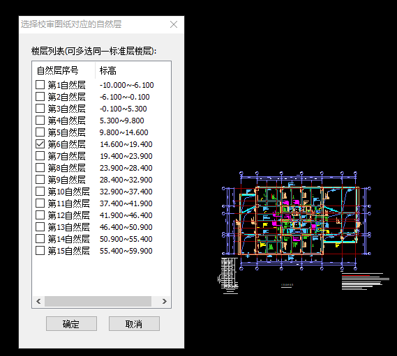 - 转换完成后弹出对话框提示是否插入整张图纸,可根据需要选择“是”或“选择区域”。选择完毕后再次弹出“选择校审图纸对应的自然层”对话框,在里面勾选对应选择图纸的楼层即可,如图所示。