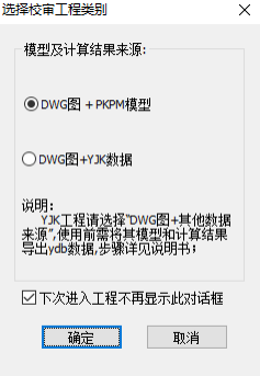 点击图纸识别按钮,程序自动跳转至BIM云审查平台结构辅助工具模块,并弹出选择校审工程类别对话框,如图所示。用户可根据所使用的软件情况,选择“DWG图+PKPM模型”或“DWG图+YJK数据”、两种模式之一。下文以前者为例,主要介绍图纸识别流程。有关BIM云审查平台结构辅助工具模块的相关功能可查阅PKPM软件说明书《施工图审查使用说明》相应章节内容。