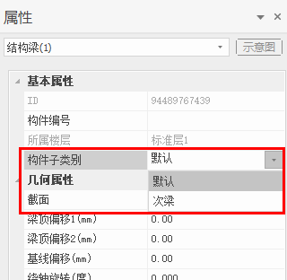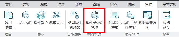 在模型创建过程中选中布置好的构件,在构件属性栏的【构件子类别管理】中下拉选择相应的子类别,此时改构件将按照子类别的相关设置进行显示。