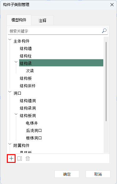 选择菜单栏中的【管理】选项卡,点击【构件子类别管理】图标,选中任意二级分类,点击新建按钮,在二级分类(即构件类别)下弹出新的三级分类输入框,输入新建的子类别名称,完成子类别的创建。