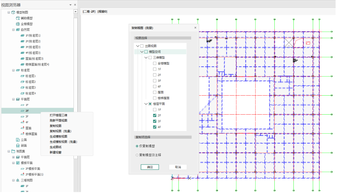 1)视图支持单个复制也支持批量复制,若选择复制视图,则直接复制当前选中的一张视图进行复制,若选中批量复制则会弹出上述对话框,可以勾选需要复制的视图进行批量复制;
