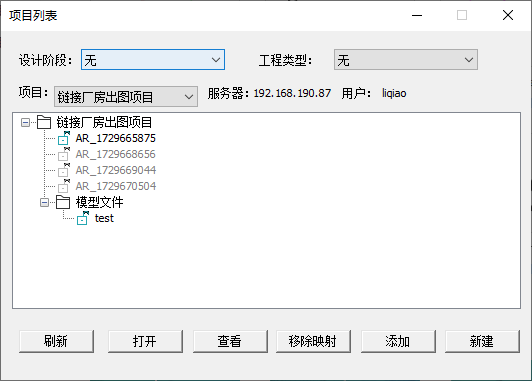 项目列表对话框列出了当前登录服务器上,该用户参与的项目。若用户参与多个项目,可在项目下拉栏中切换选择,下方项目树中显示选择项目的文件夹和模型文件。
