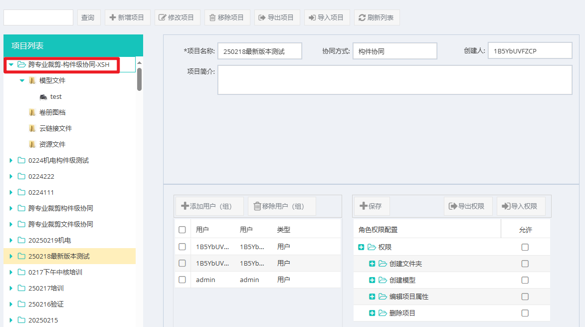 注:移除项目会同步删除项目中的所有文件夹和模型<导出项目>:在项目列表中选中某个项目,点击【导出项目】按钮,可导出项目数据信息;