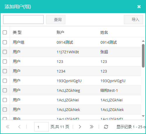 - <添加用户(组)>:点击【添加用户(组)】,弹出对话框如图4,勾选需要添加的用户或用户组,点击【导入】,将选择的用户或用户组添加进项目成员;