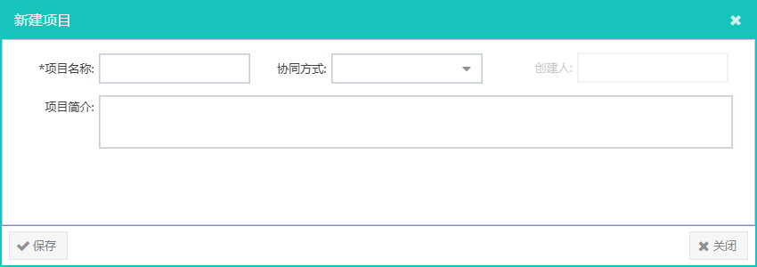 <新增项目>:点击【新增项目】按钮,弹出对话框如图2,在对话框中输入项目名称、协同方式和项目简介,点击【保存】完成项目新增;