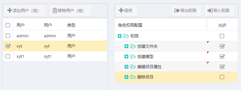 - <权限设置>:在用户列表中勾选用户(组),可在右侧配置用户权限,包括创建文件夹、创建模型、编辑项目属性和删除项目,如图5,点击【保存】按钮保存设置;