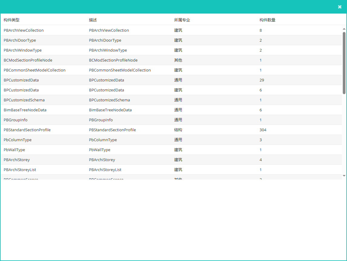 <构件统计>:点击【构件统计】按钮,弹窗中可显示此模型中所有构件的构件类型、所属专业和构件数量;