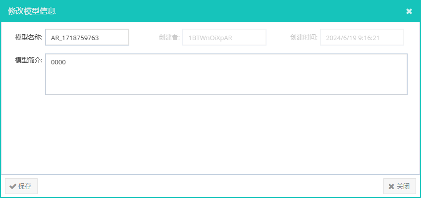 <修改模型>:点击【修改模型】按钮,在弹窗中修改模型名称和简介,如图2,点击【保存】完成修改;
