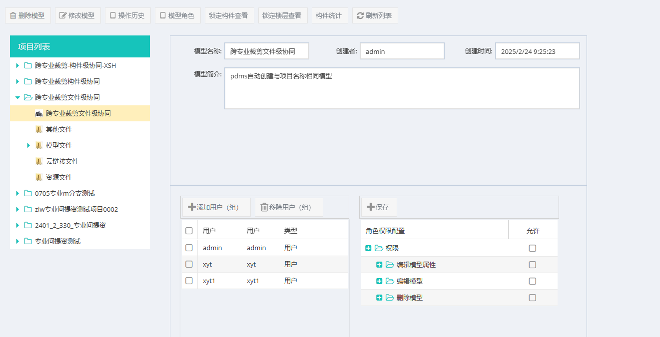 点击选中项目列表中的项目下的模型层级,如图1,可在顶部对模型进行相关编辑,并在右侧进行模型成员权限设置。