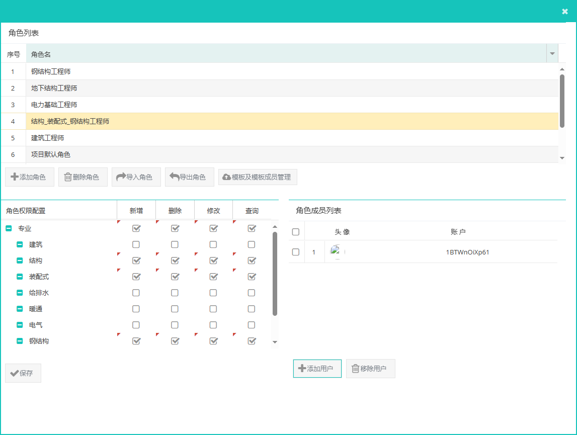<模型角色>:点击【模型角色】按钮,在弹窗中可为项目成员分配不同角色,并设置每个角色的相关专业权限,如图4;在角色列表可自由添加团队成员角色,也可以通过模版导入角色设置,界面下方针对每个角色设置相关专业权限和角色内人员;