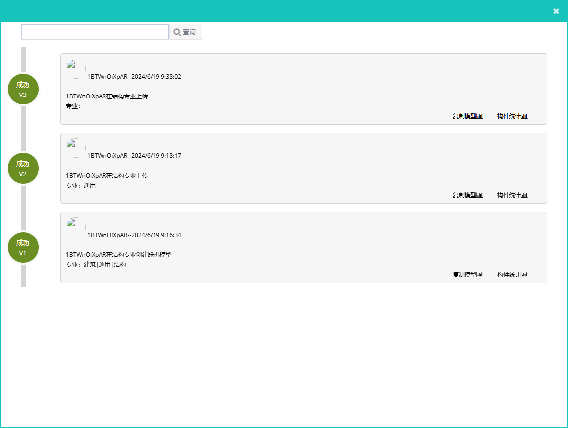 <操作历史>:点击【操作历史】按钮,在弹窗中可查看此模型的修改上传记录,在界面中可对历史模型进行复制和构件统计,如图3;