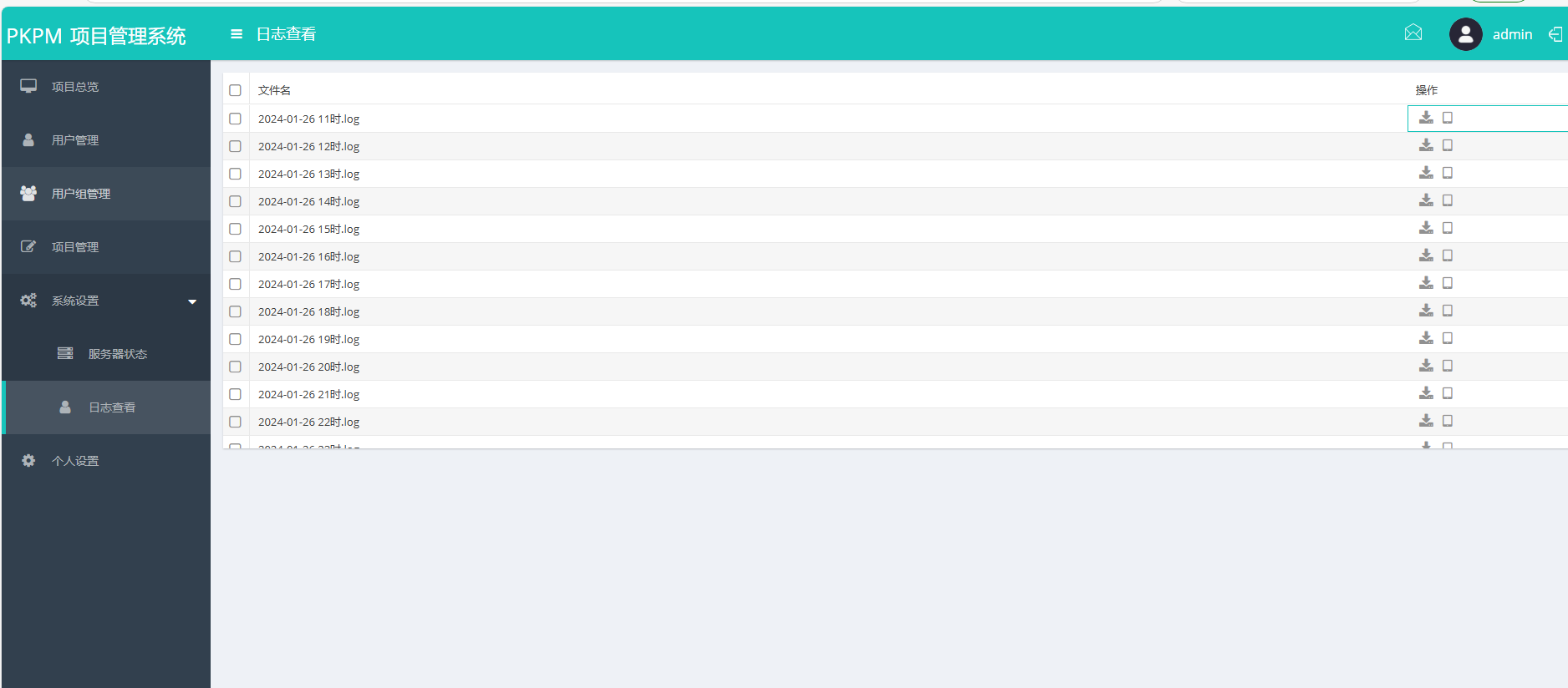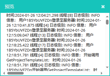 目录 搜索 展开 首页乘车路线网页端管理系统项目总览用户管理用户组管理项目管理项目管理文件夹管理模型管理系统设置服务器状态日志查看个人设置客户端协同工作客户端协同工作打开团队项目解锁上传上传下载权限管理批量锁定锁定当前专业查看构件权限恢复原色显示打开项目消息服务端综合管理系统服务器中安装的程序及流程协同服务配置小工具、打开协同管理系统配置协同服务、清空缓存、退出 暂无相关搜索结果! 日志查看 功能介绍可查看系统中的log日志文件,当服务器发生问题时可查看日志追溯问题及时处理。 使用说明点击左侧系统设置-日志查看按钮,显示页面如图1,可以看到项目管理系统中的log日志文件。 <下载>:点击日志列表右侧的下载按钮,可下载log文件; <预览>:点击日志列表右侧的预览按钮,可预览选中的log文件,如图2。 图1 日志查看界面 图2 日志文件预览