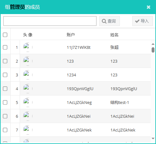 - <添加用户>:在组组成员列表下方点击添加用户按钮,弹出对话框如图3,勾选需要添加的成员,点击导入,将成员加入用户组;
