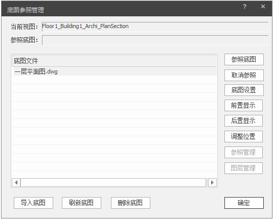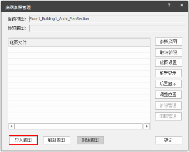 底图参照功能支持将.dwg格式文件导入到当前项目中作为底图,供各专业建模进行参照。底图参照对话款包含参照管理、底图导入、刷新、删除管理、底图设置,如下图所示。