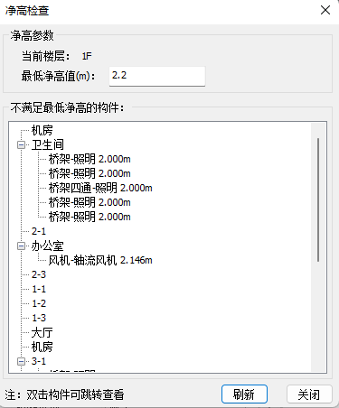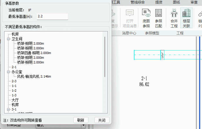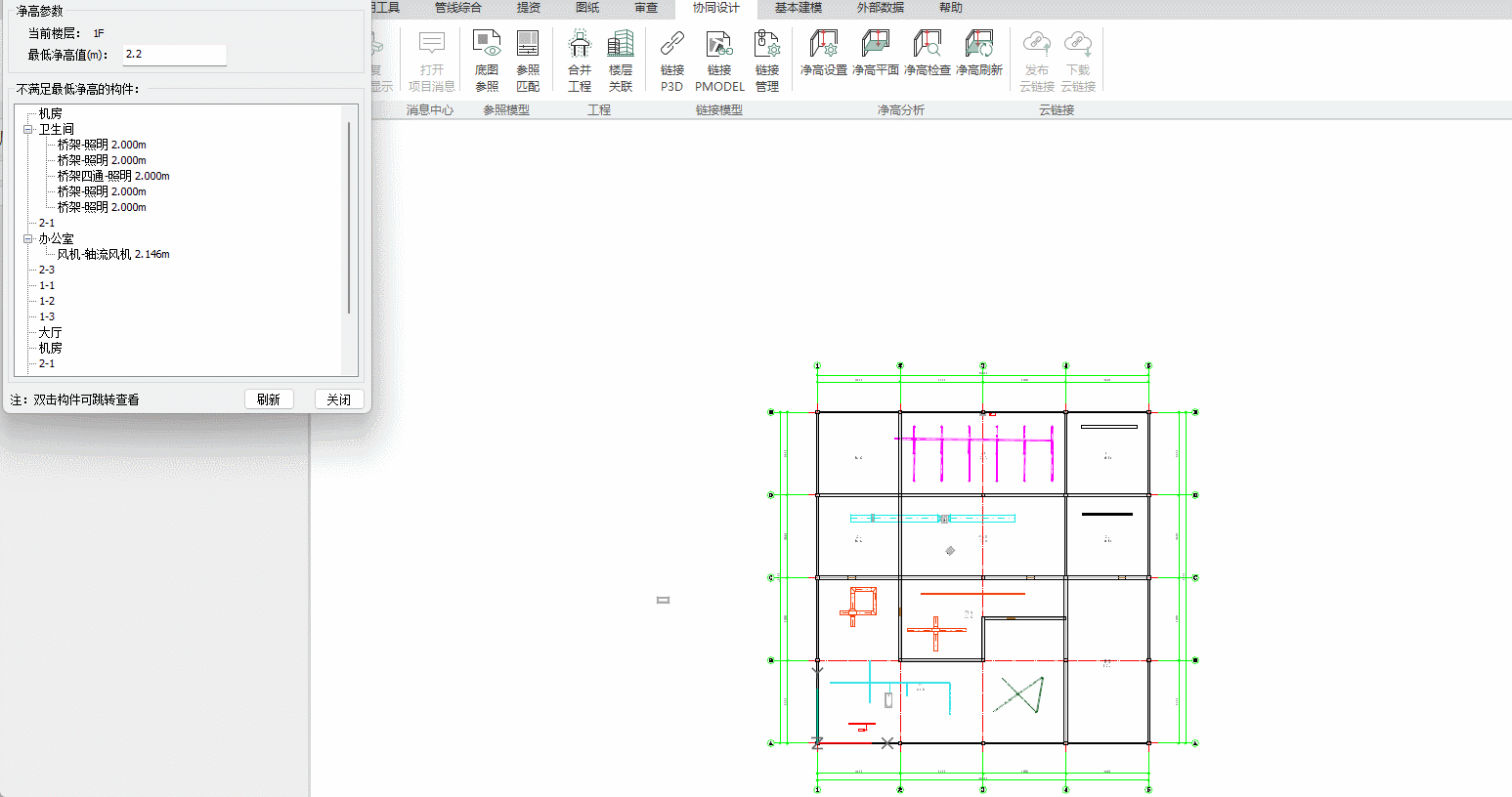 修改界面上的“最低净高值”的数值,点击刷新按钮,可按照新净高值重新检查计算,并刷新检查结果。如下动图所示: